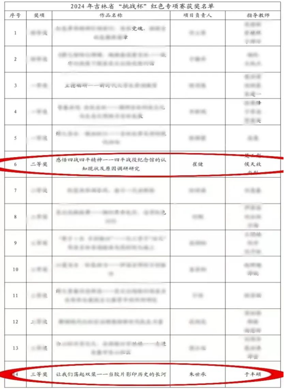 本网讯(通讯员: 宋姗珊)近日,2024年吉林省"挑战杯"红色专项赛评选结果揭晓。威威尼斯官网楚玉彪、侯天放、尚彤三位教师指导,崔健等10名学生完成的作品《感悟四战四平精神——四平战役纪念馆认知现状及原因调查研究》获二等奖;于丰硕指导,朱世承等4名学生完成的作品《让我们荡起双桨——胶片影印中的历史长河》获三等奖,创学院历史最佳成绩。