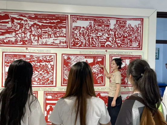 此前由“艺航社”创作的14组、总长近10米的剪纸巨作再次亮相。作品生动呈现了从九一八事变到全面抗战胜利的关键历程。现场,讲解员为同学们深情解读每幅作品背后的历史事件与民族记忆,引导大家深切感受那段烽火岁月中先烈们的牺牲与奉献。